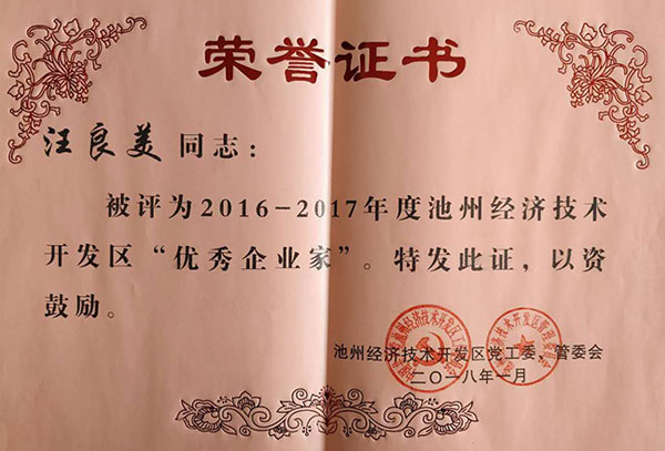 2018年1月31日, 池州市經(jīng)濟(jì)技術(shù)開發(fā)區(qū)召開了2018年度工作會(huì)議, 會(huì)議表彰了2017年度開發(fā)區(qū)優(yōu)良企業(yè)(項(xiàng)目)和優(yōu)良企業(yè)家,恒生集團(tuán)繼榮獲“突出進(jìn)步獎(jiǎng)后又”榮獲“創(chuàng)新發(fā)展獎(jiǎng)”,汪良美董事長再次被評(píng)為2017年度“優(yōu)秀企業(yè)家”。