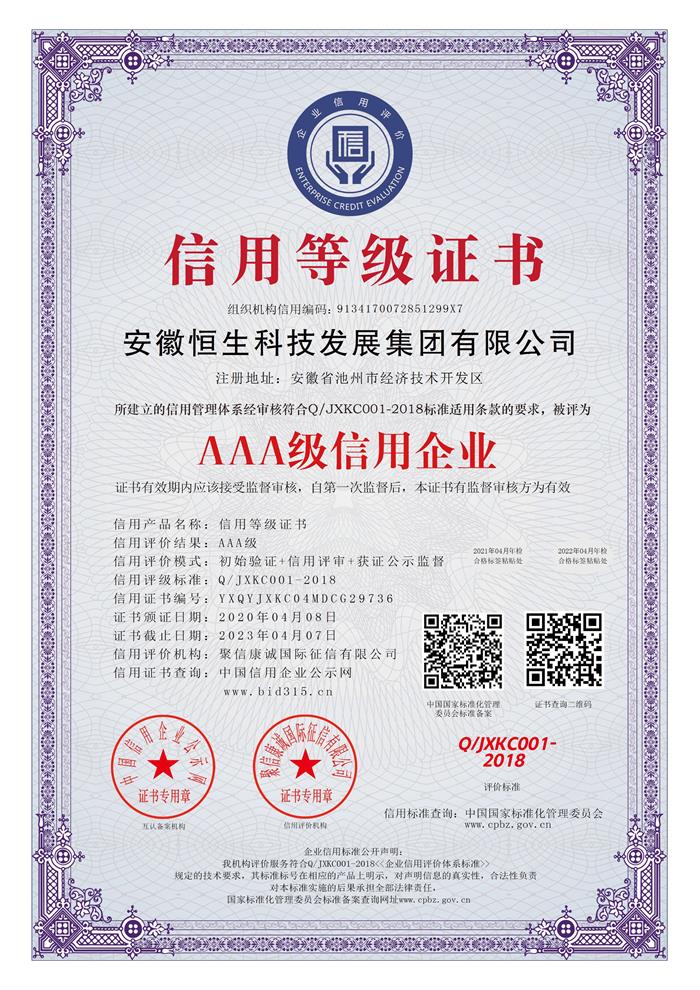 信用等級(jí)認(rèn)證證書(shū)AAA級(jí)